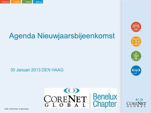 2013 Onze voorzitter neemt u graag mee in de ambities en plannen van het CoreNet Benelux bestuur voor 2013 |